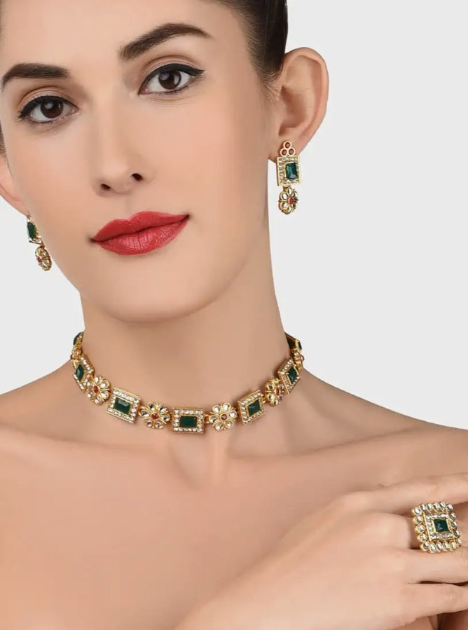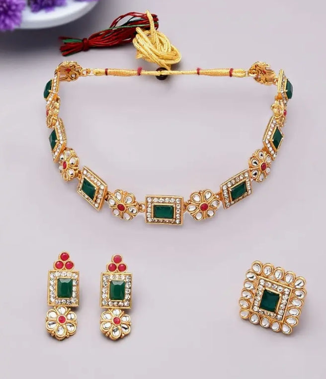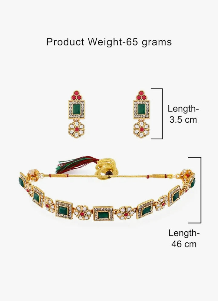 Designer Kundan Choker Set for Women | Zaveri Pearls | Brass Rope Chain | Pink & Green | 22K Gold Plated Necklace with Earrings & Ring